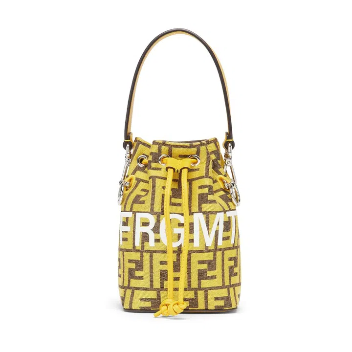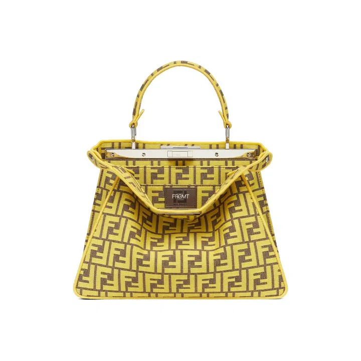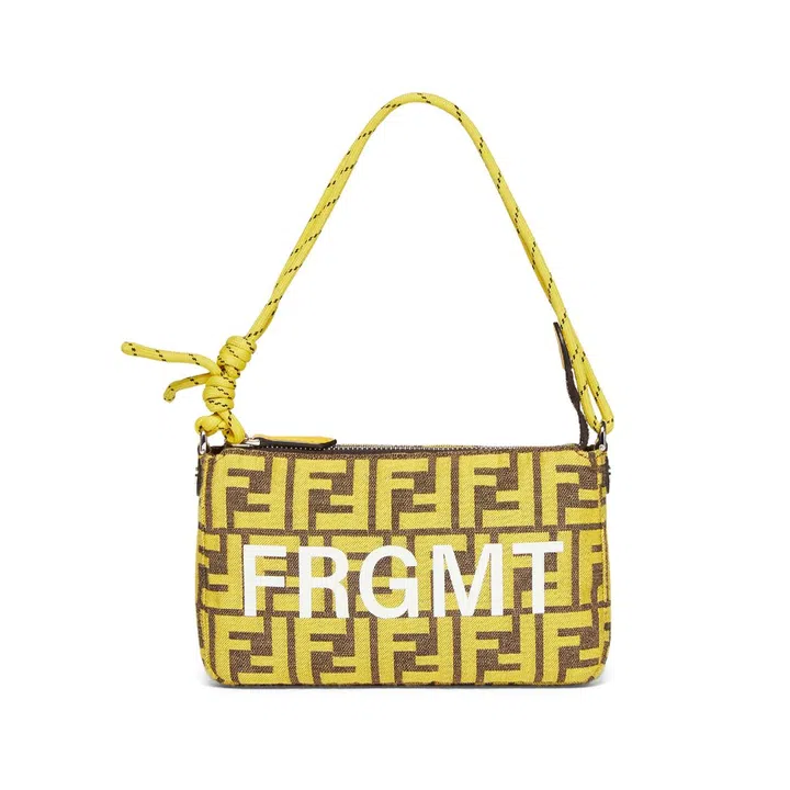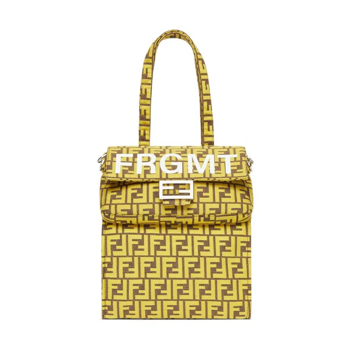 The Fendi x FRGMT line reinterprets Hiroshi’s FRGMT logo on the iconic FF jacquard logo in Fendi's institutional brown and tobacco shade and an unexpected bold yellow version.