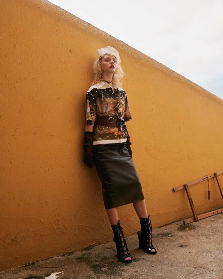Cotton poplin shirt, leather skirt, matching choker, cotton sailor cap, metal charm with leather (worn as pendant), leather corset belt with metal embellishments, wool gloves, and velvet peep-toe booties, Prada