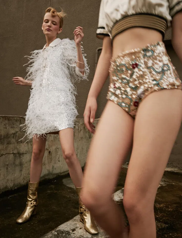 Left: Michael Kors Collection silk-blend dress with sequins and feathers, Michael Kors. Leather boots, Coach. Right: Silk cropped top and matching briefs with sequins, Tommy Hilfiger