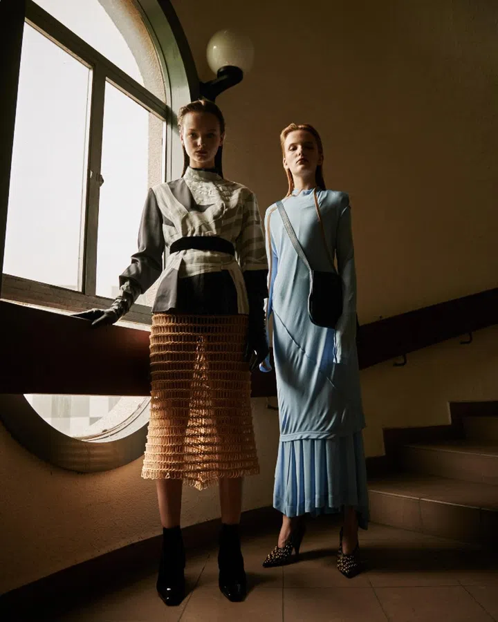 Left: Silk top, rubber band skirt with leather, and patent leather booties, Loewe. Leather gloves, Hermes. Belt, stylist’s own. Right: Silk tunic, matching column dress (worn inside), Ribbon leather shoulder bag, and leather pumps, Celine