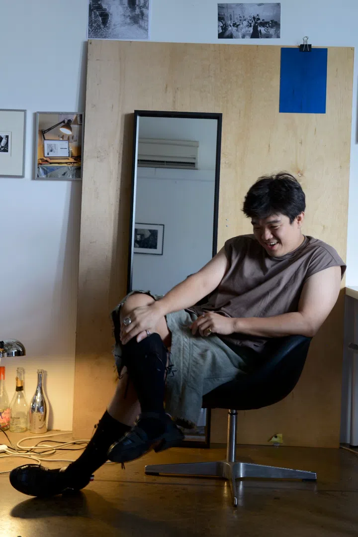 HIS FAVOURITE DESIGNERS: “I wouldn’t say I prioritise brands or designers when making a purchase, but I do have my go‑tos because their aesthetics align with what I find beautiful. The brand’s universe needs to make sense to me and match my personal style for me to fully buy into it. Since my university days, I’ve consistently bought Rick Owens – usually one or two pieces a season if I can afford it. In the last couple of years, I’ve also got into Thom Browne. To me, these two brands represent two sides of the same coin. I’ve always had a soft spot for Belgian designers too … I’m really hoping Marie Adam‑Leenaerdt does menswear because I’d love something from her in my size. There’s a sincerity in Belgian design that really resonates with me. You don’t see a lot of this now in the industry.”