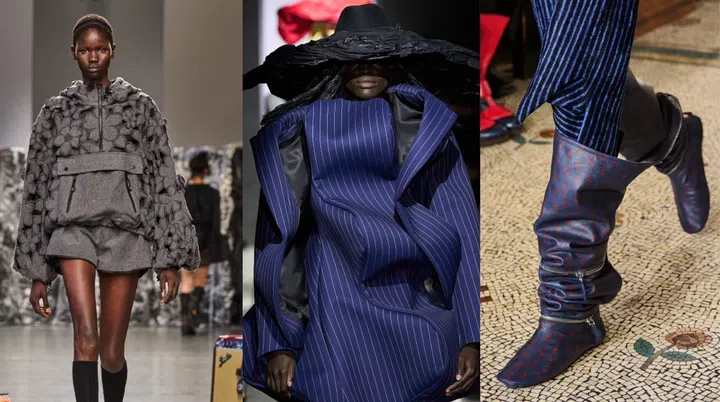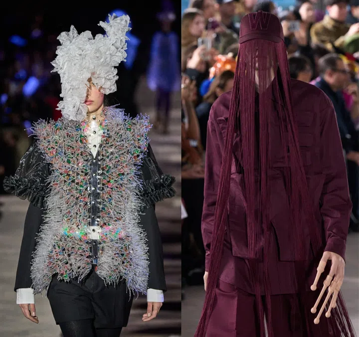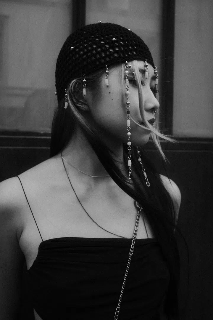 WHAT SHE WOULD BUY FROM FW2025 IF MONEY WERE NO OBJECT: “(Left to right, above) A Cecilie Bahnsen parka – I love how she blends femininity and techwear; a dress from Comme des Garcons – Rei Kawakubo will always be one of the designers I respect most because of how much she pushes the boundaries of fashion, like how she literally put a twist to corporate wear this season; the Modular Driving Boots from Kiko Kostadinov, which remind me of the Arts And Crafts boots from Undercover’s Fall Winter 2005 collection – one of my favourite shoes of all time; (left and right, below) a vest from Noir Kei Ninomiya that I find is particularly innovative and experimental this season, and that reminds me of a coral reef; and the fringed headpiece from Walter Van Beirendonck – I’ve been collecting accessories by the namesake desginer and was pretty gagged when I saw it on the runway because it’s such a statement piece.”