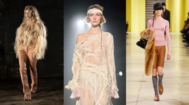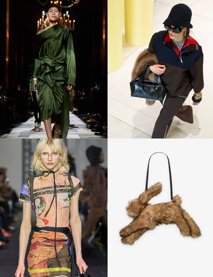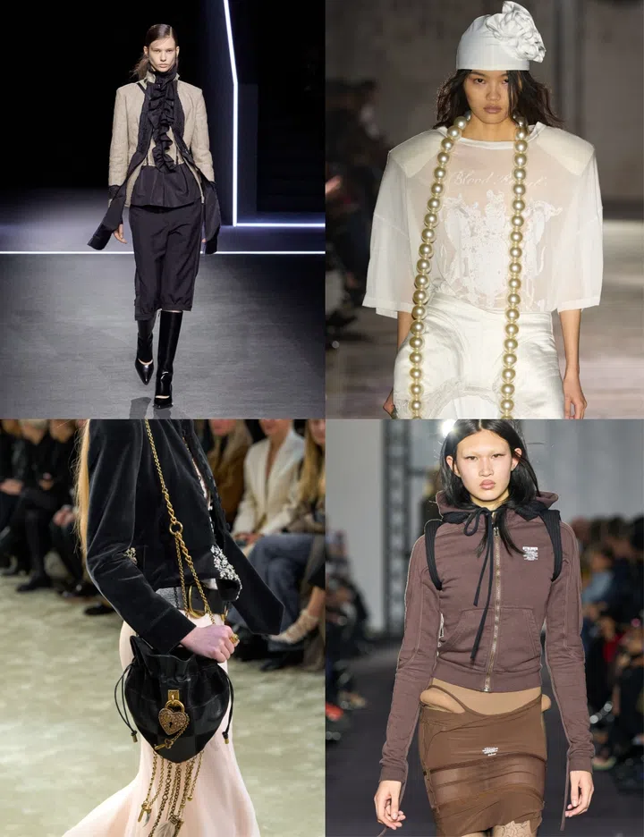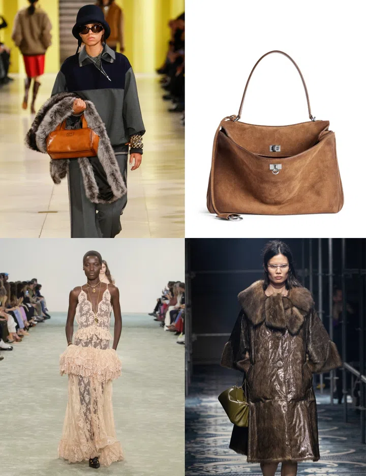 WHAT SHE WOULD BUY FROM FW2025 IF MONEY WERE NO OBJECT: “I’d choose mostly pieces that have a vintage feel to them: (clockwise from top left corner, above) a tracksuit from Miu Miu; this rendition of the Balenciaga Rodeo bag; this faux fur‑trimmed leather Prada coat; and a lace dress from Chloe. The Prada coat stands out in particular for how it looks like a ridiculously oversized subversion of a classic fur coat. The bow around the neckline raises the camp factor.”