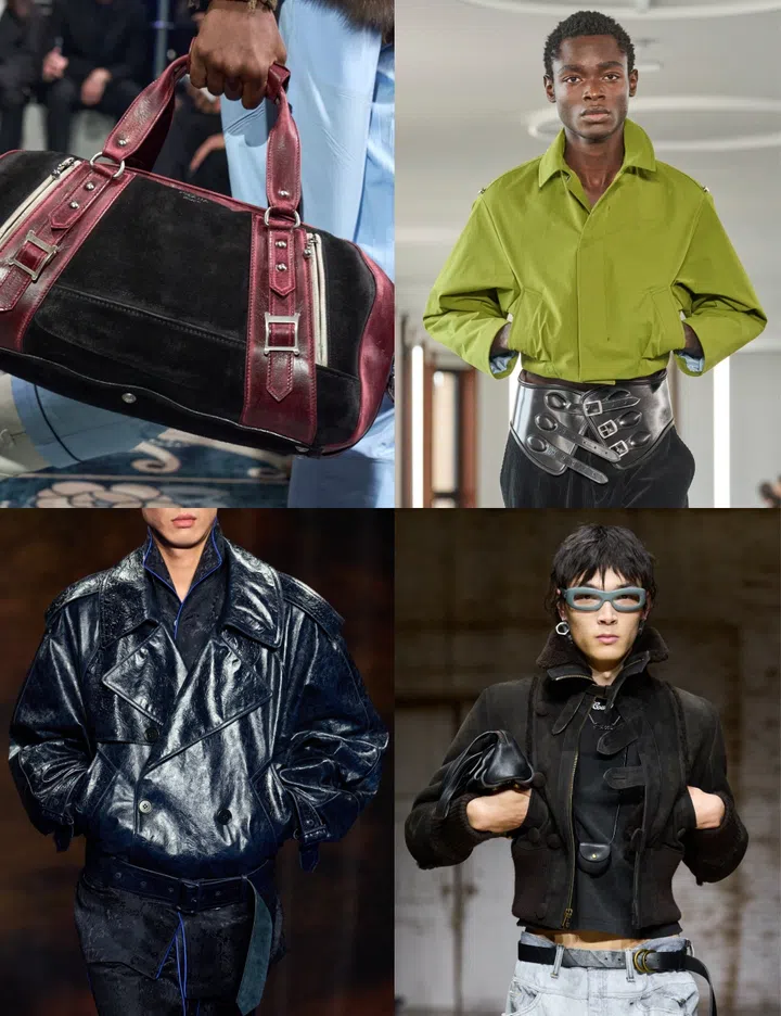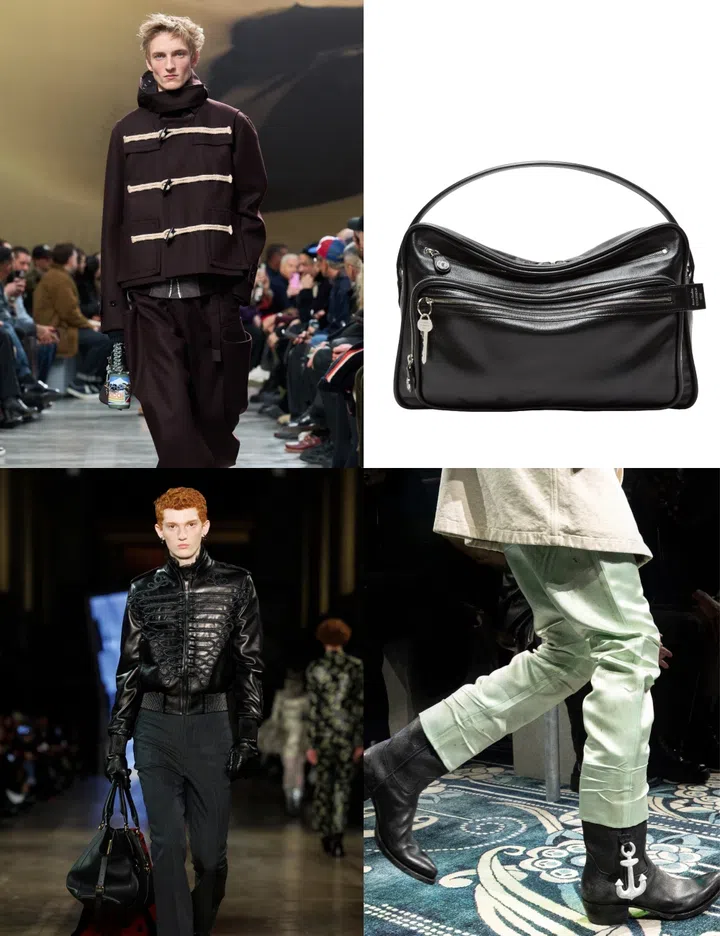 WHAT HE WOULD BUY FROM FW2025 IF MONEY WERE NO OBJECT: “I generally gravitate towards things that are well-made and reflect craftsmanship as well as a clear design intention. This season, they include (clockwise from top left corner, above) Prada’s suede duffle bag, Bally’s corset belt, a cropped blouson and an extra‑long belt from Coach, a motorcycle jacket from Burberry, (clockwise from top left corner, below) a full Sacai look, the Camero bag from Acne Studios, the cowboy boots from Prada and an Alexander McQueen military coat. I’m a big fan of Miuccia Prada and I think that Prada has really found its own rhythm, especially with her teaming up with Raf Simons. Every collection is minimalist at its core, but has something odd or unexpected about it. I also really appreciate its commitment to quality, which I feel has been slipping at some other houses.”