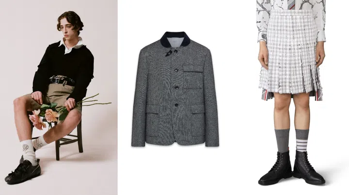 WHAT HE WOULD BUY FROM FW2025 IF MONEY WERE NO OBJECT: “(Above, from left) A rugby shirt with ruffles from Simone Rocha, and a sport coat and a tweed skirt from Thom Browne. These items are things I’d wear on a routine basis. Some are newer versions of what I already have in my wardrobe and would reach for regularly, but with a different texture or in a different colour from what I already own.”