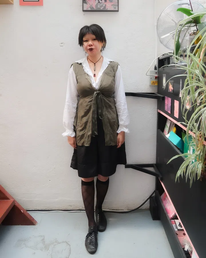 HER MOST EXPENSIVE FASHION PURCHASE: “It’s a 2008 Balenciaga Le City bag … I’ve nicknamed it ‘Glamour Toad’ because it’s green and comes decorated with a pink floral motif. I wouldn’t trade anything for it, since the bag has become such a personal item that saw me through various phases of life. It cost me around $700 at the time (2022) on Carousell, and I had to gather all the pay I got from my past internships and part‑time jobs to afford it.”