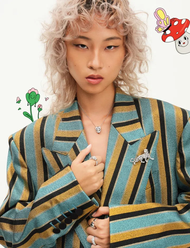 On Saima: Celine by Hedi Slimane wool blazer, cashmere turtleneck sweater, cotton shorts and leather boots with sequins, Celine. Panthere de Cartier yellow gold necklace with black lacquer, tsavorite garnets, onyx and diamonds; Panthere de Cartier yellow gold earrings with tsavorite garnets, onyx and diamonds; Panthere de Cartier yellow gold ring with black lacquer, tsavorite garnets and onyx (on left index finger); Panthere de Cartier yellow gold ring with black lacquer, tsavorite garnets, onyx and diamonds (on left ring finger); and Panthere de Cartier yellow gold ring with tsavorite garnets and onyx (on right middle finger). All jewellery, Cartier