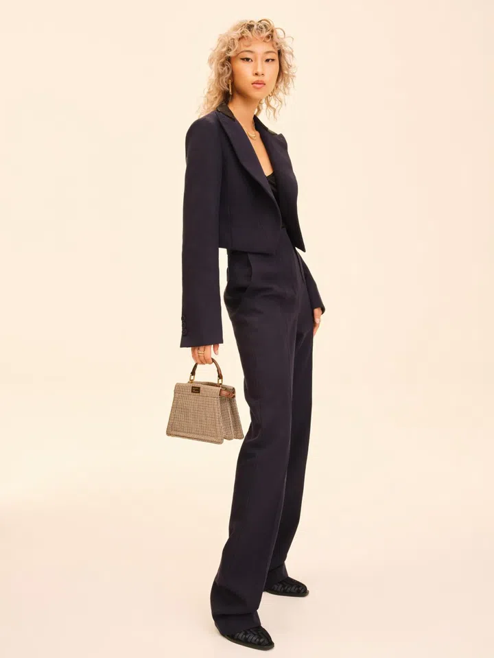 On Jessica: Wool jacket and matching pants, silk blouse, Peekaboo ISeeU Petite wool top-handle bag and leather pumps, Fendi. Clash de Cartier pink gold small hoop earrings and large single earring; as well as matching small and medium necklaces, and small and medium rings (on right third finger). All jewellery, Cartier