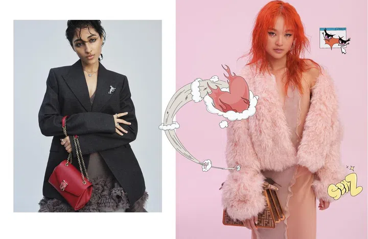 On Kerni (right): Mohair jacket, chiffon slip dress and Peekaboo viscose-blend small top handle bag, Fendi. Clash de Cartier pink gold small hoop earrings. All jewellery, Cartier