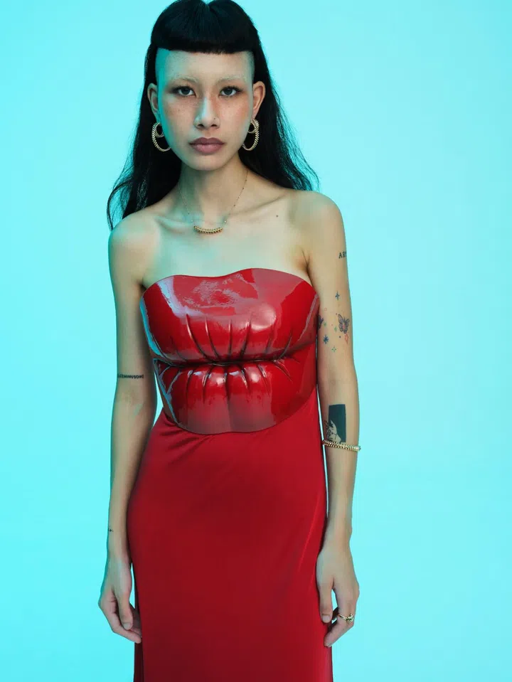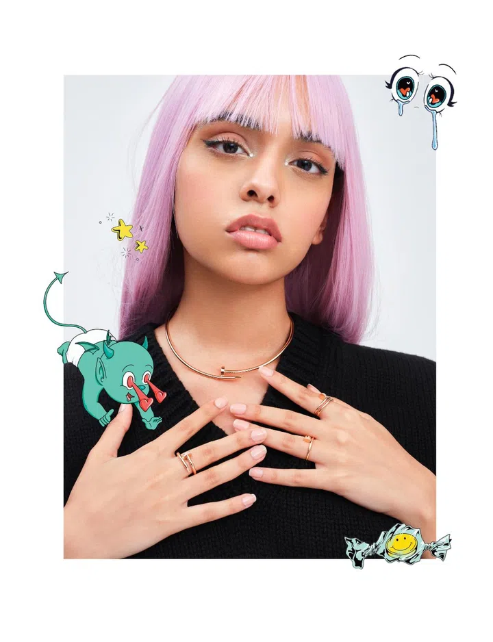 On Jenica: Silk dress with resin bustier, Loewe. Clash de Cartier pink gold small and double row hoop earrings; matching small necklace, medium bracelet and large ring (on left index finger). All jewellery, Cartier