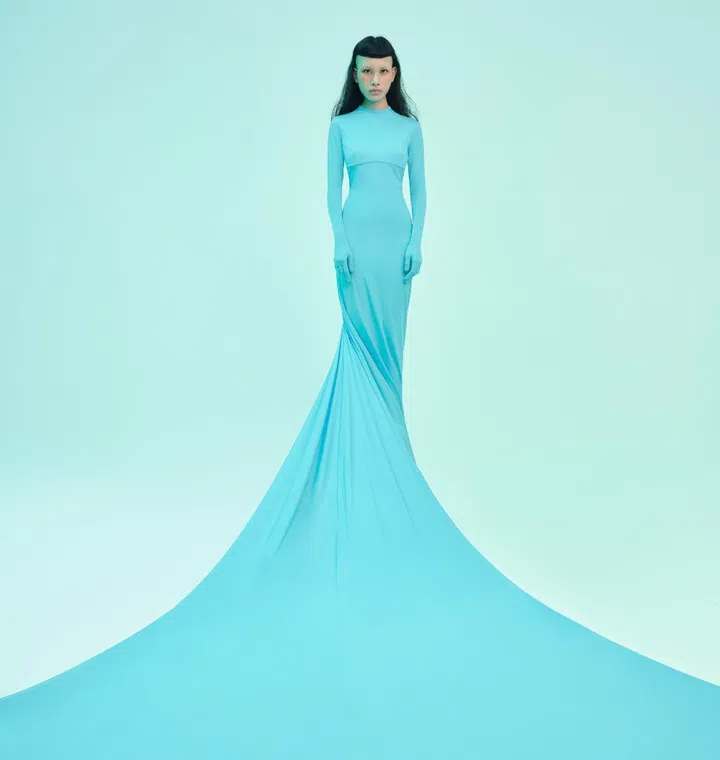 On Jenica: Spandex swimsuit gown with attached gloves, Balenciaga