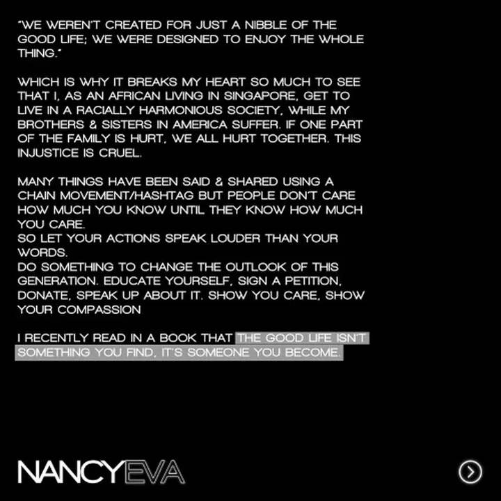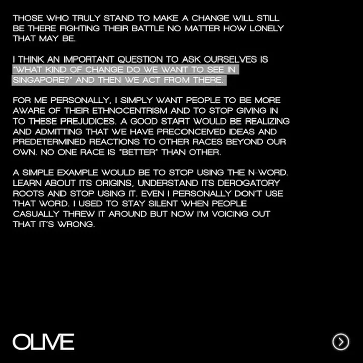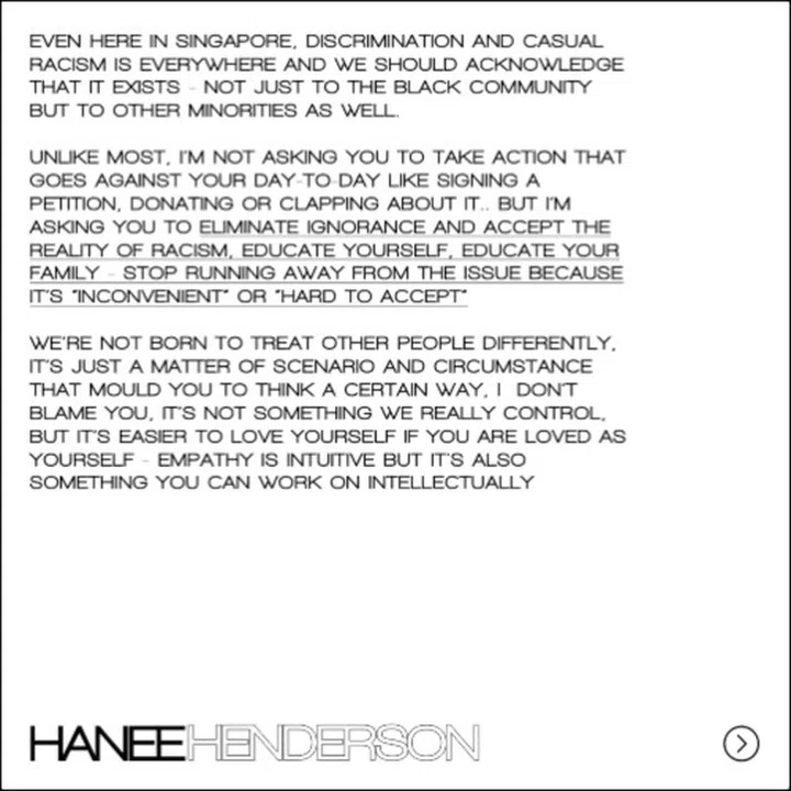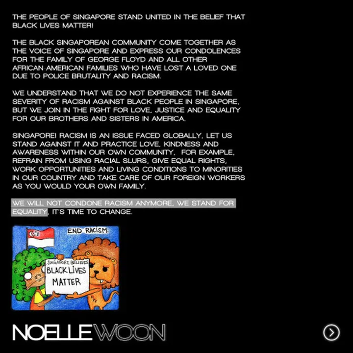 I want to create a platform and forum for the African voices in Singapore and to shine the spotlight on the African community here. But I also want to encourage and educate Singaporeans to speak up on the matter – to tell them that it's not okay to use racial slurs and to go forth and sign the anti-racism petitions. Most importantly, we need to show our support to the African-American community and everyone else fighting for black lives through peaceful protests and petitions.
