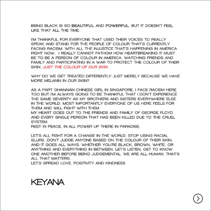 As demonstrations protesting racial discrimination against blacks reached a crescendo worldwide last week, 17-year-old Singapore/up-and-coming musician Keyana decided to use her platform as a Gen Z influencer to affect change. In a matter of days, the Chinese-Ghanaian kickstarted a social media campaign called 'Our Voices' featuring some of her friends from the African community here to rally Singaporeans to be an ally in supporting the numerous online petitions condemning racial bias. Here, she tells us why she is using her platform for the cause and shares six testimonials of what being a person of colour means in Singapore.