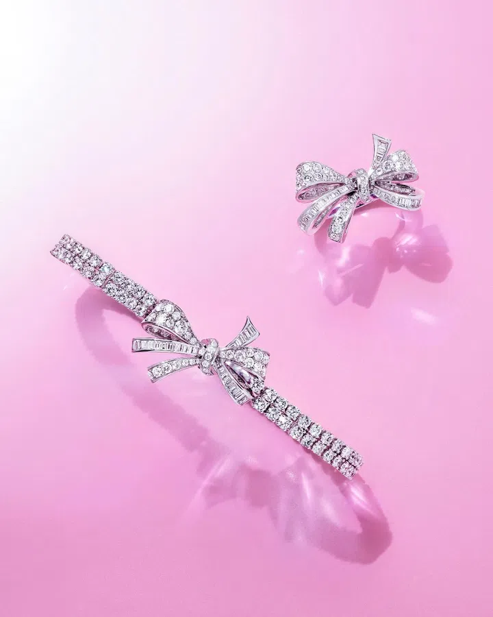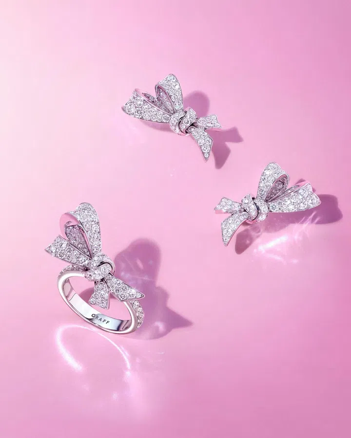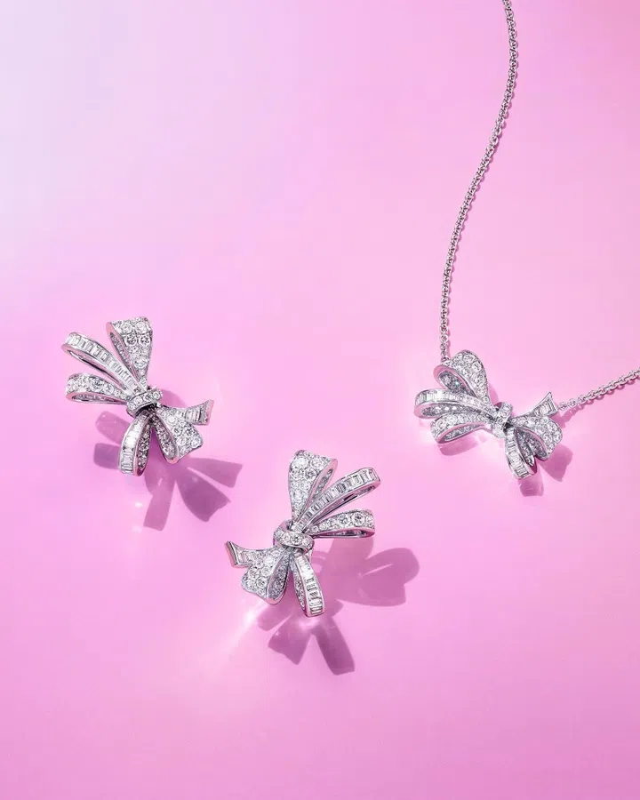 Clusters of diamonds are spun into enchanting pieces of bow-motif jewellery.