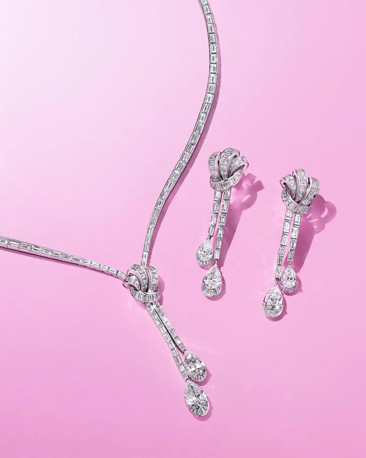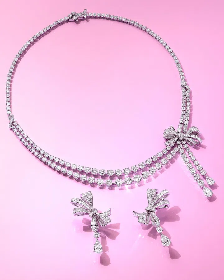 From left: Tilda’s Bow 18K white gold earrings with diamonds, $27,000, and matching necklace, $24,000