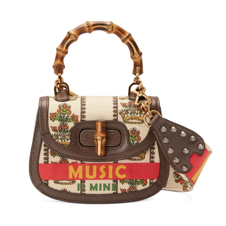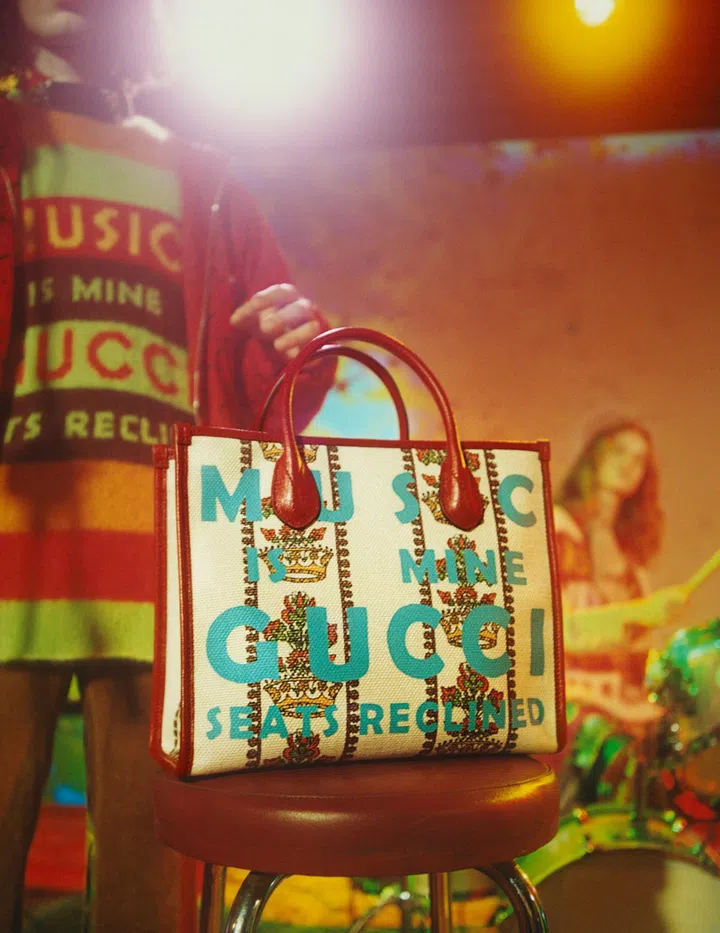 A selection of these lyrics is forever immortalised as prints on items such as totes and clutches of the Gucci 100 collection which are given creative director Alessandro Michele's trademark vintage treatment with vintage motifs like wallpaper prints and insignias.