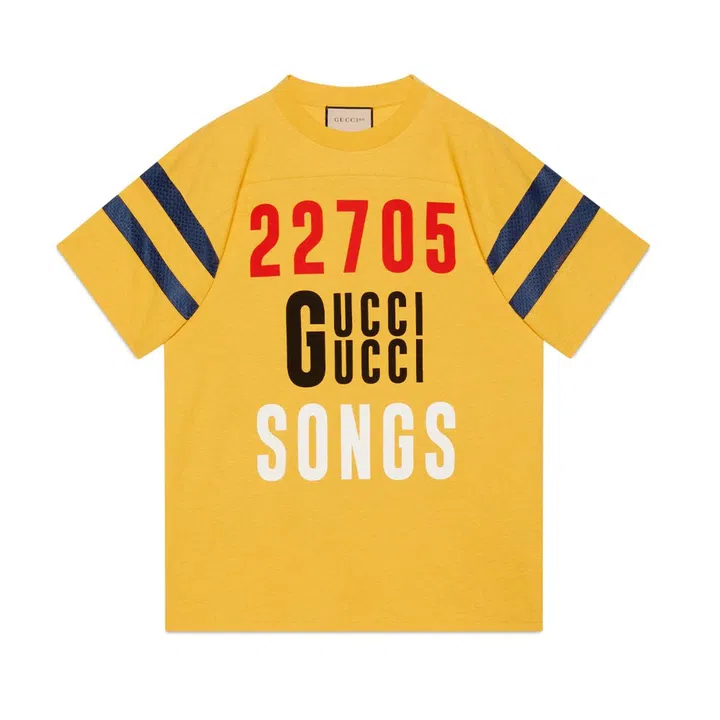 Song lyrics that mentioned Gucci appear as slogans on several designs of the Gucci 100 capsule.
