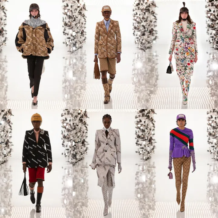 That creative process saw iconic Balenciaga looks from past seasons such as the sculpted skirt suits and the boots-tights hybrid making a comeback. These items were treated with a variety of prints that featured a mashup of the Balenciaga logo with the likes of Gucci's Flora print or GG Supreme monogram.