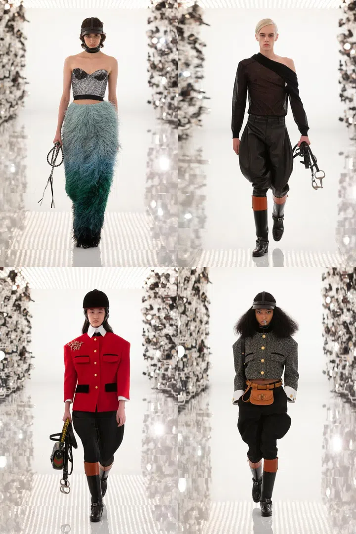 The equestrian heritage of the house (Gucci’s started out making saddles and accessories for horseback riders) was celebrated in a big way. Riding boots were ubiquitous and added polish to short suits, jodhpurs, midi dresses and skirts. Harnesses – worn under buttoned-down shirts and with tuxedoes – exuded fetishsized glamour, while other equine-themed accessories came in the form of jockey caps and horse whips.