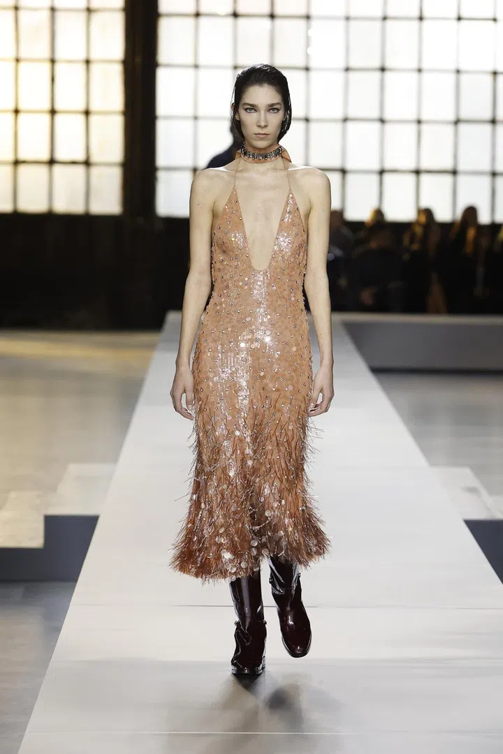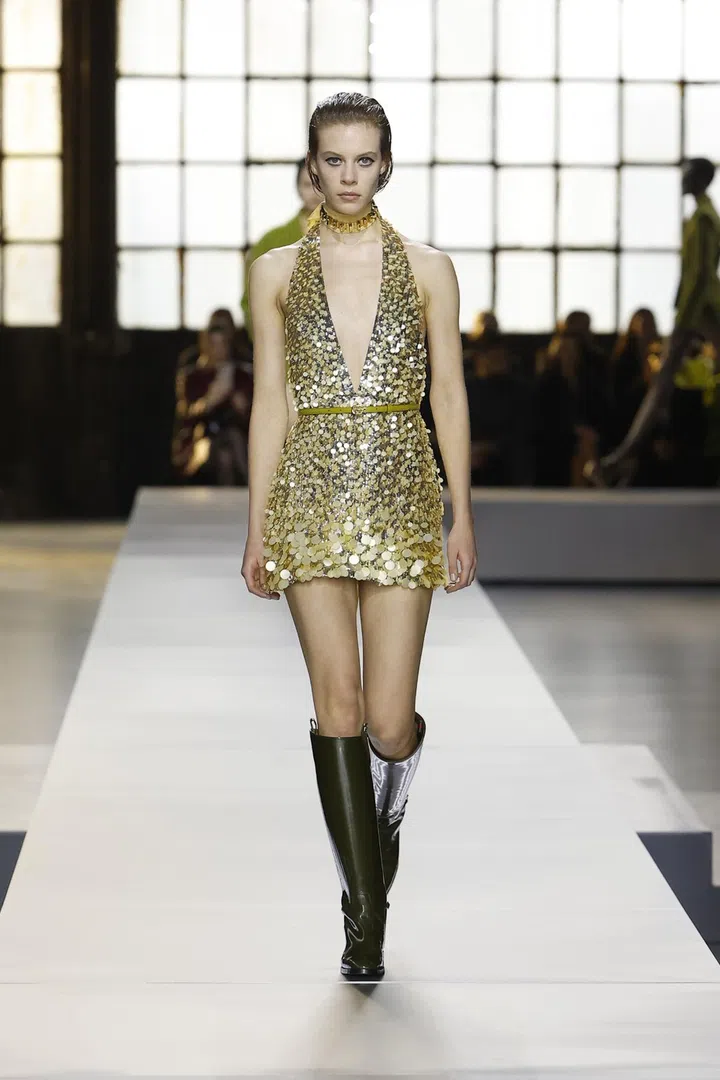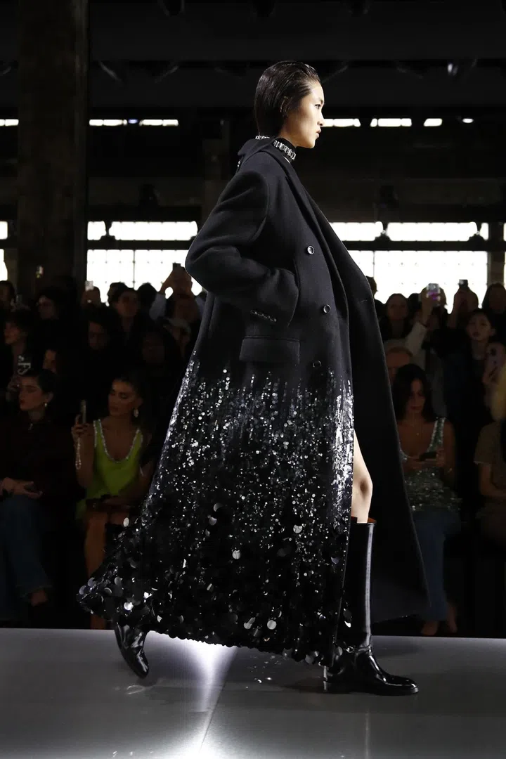 De Sarno certainly has a way of elevating the ordinary; the outerwear is clearly one of the stand-outs of the collection - think boxy peacoats, parkas and overcoats with hems festooned with ombre paillettes and sequins. The designer appears to prefer building an ongoing narrative - he continued the leggy silhouette he introduced last season, pairing micro tailored shorts with formal jackets and long coats, and the platform kicks from Spring Summer 2024 remained (this time in pumps instead of loafers). Pants were non-existent at the show, though De Sarno says they will be sold in stores when the collection hits retail.