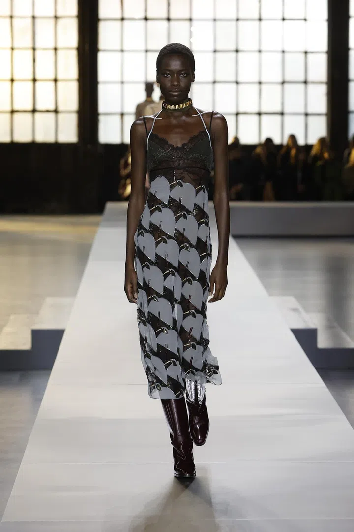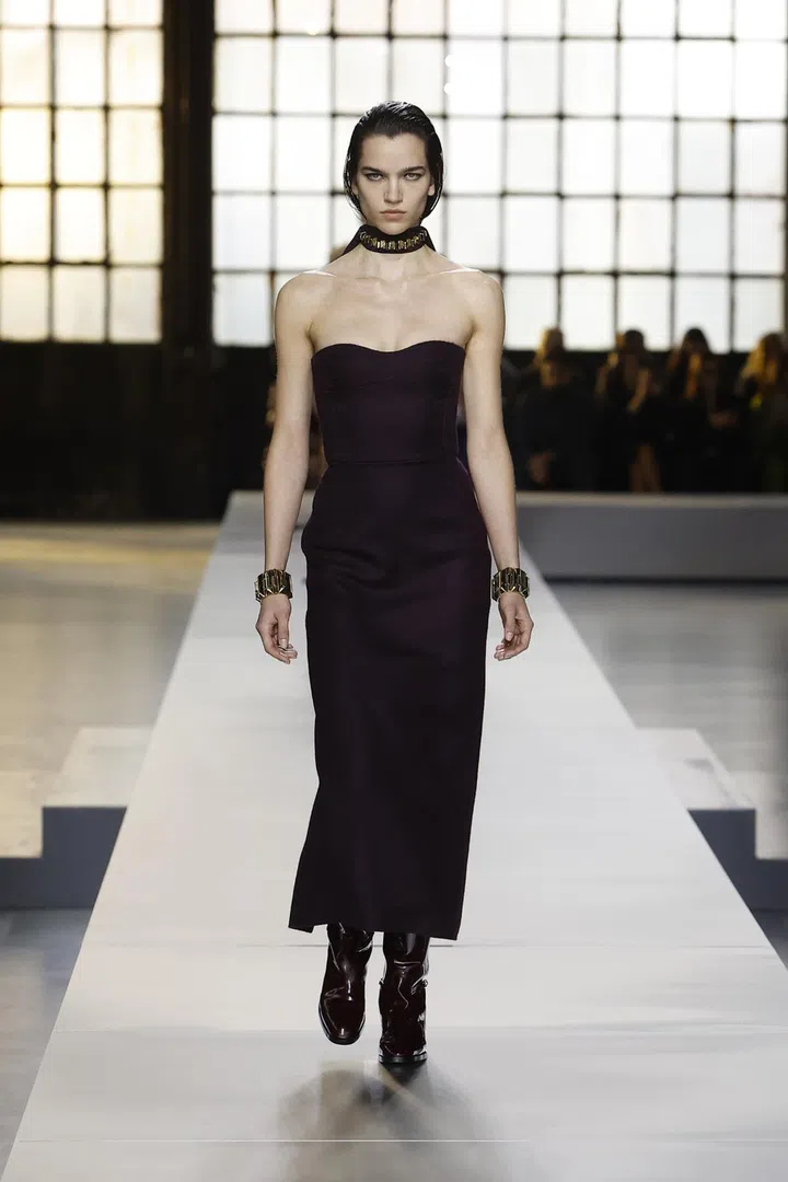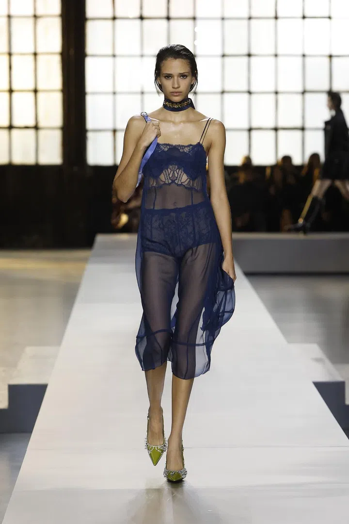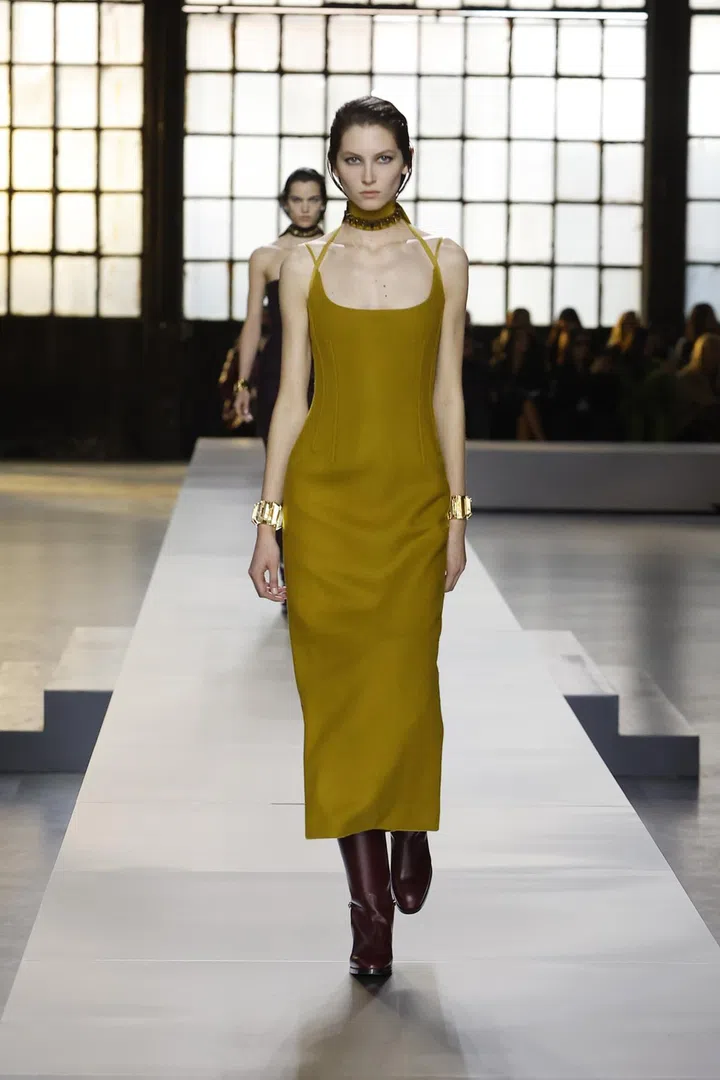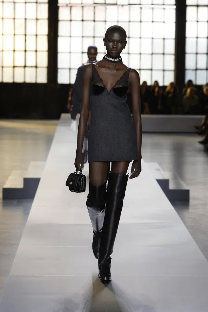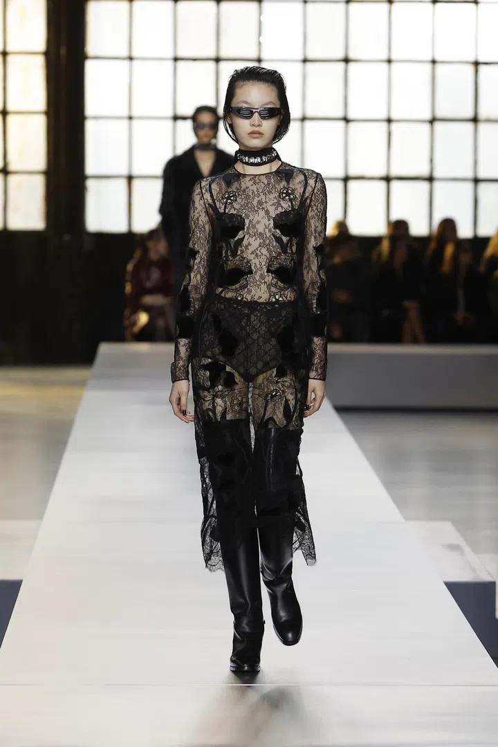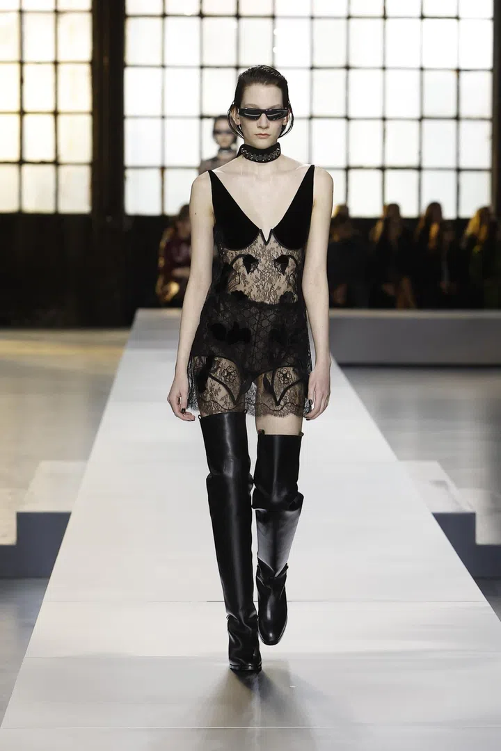 He expanded on the nightwear section, sending out slinky lace and velvet slip dresses that will likely appear on a red carpet soon, anchoring them with thigh-high or over-the-knee boots that nodded to Gucci's equestrian heritage.