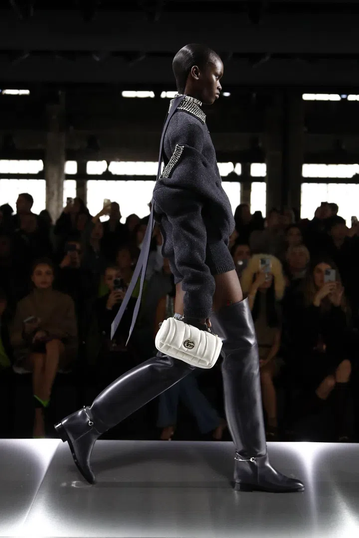 The looks we're eyeing: There was a noticeable emphasis on accessories, especially bags. Most eye-catching was a new top-handle, half-moon style (looks 1, 2, and 3) that was reportedly inspired by the equestrian motifs found in the Gucci Archive, as well as a cute miniature bucket bag that came with the maison's signature bamboo handles (looks 19 and 20). We'll take all the stompy equestrian boots too, as well as the exceptional outerwear, such as Look 23's patchwork leather coat.