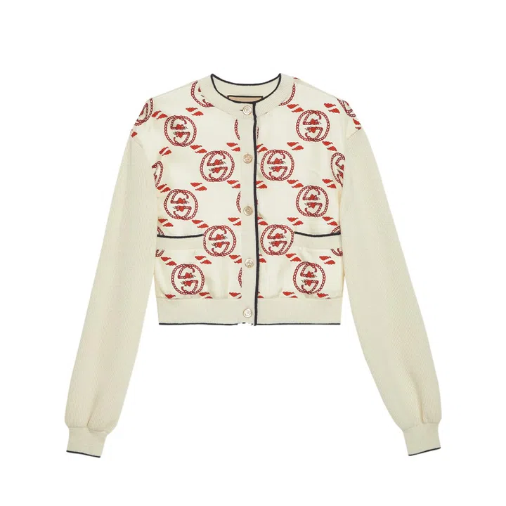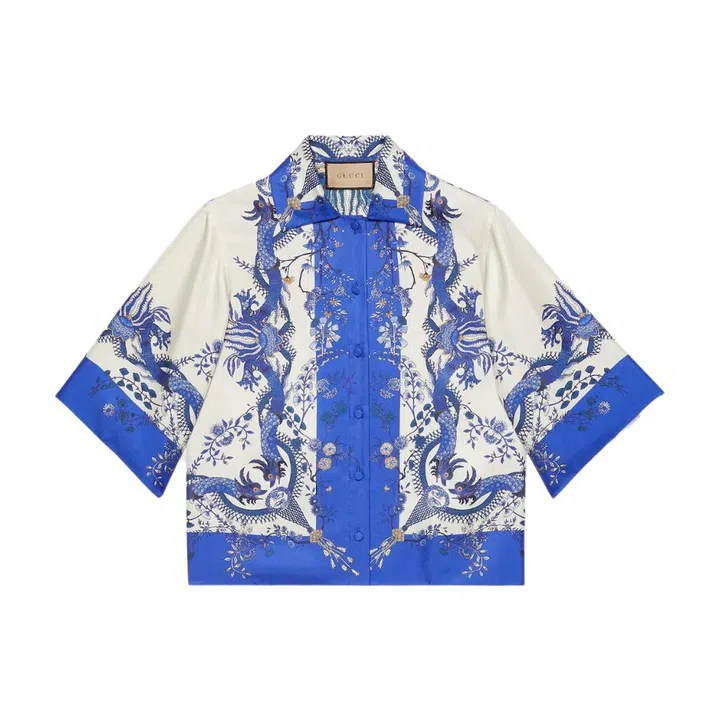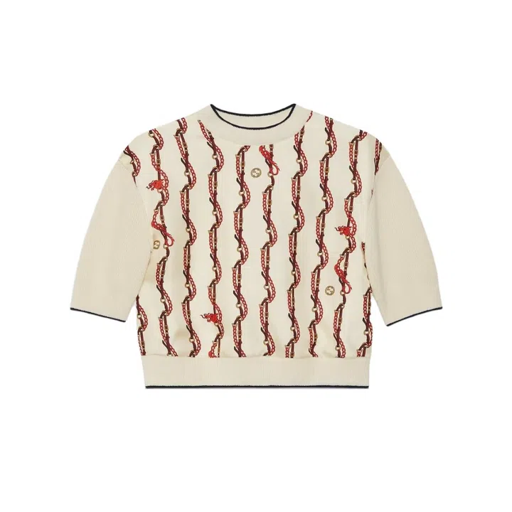The equestrian print, an ode to Gucci’s heritage, meets the bold and regal dragon in this fine wool top. There’s no clash of cultures here, though, as both elements intertwine and meld into each other in a sophisticated and refined pattern.