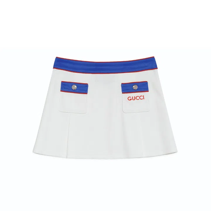 Tennis chic is in this season, and it's all thanks to this one-of-a-kind jersey mini-skirt. The delicate embroidery details and its visual simplicity make this one of the quieter, but equally charming, pieces in our selection.