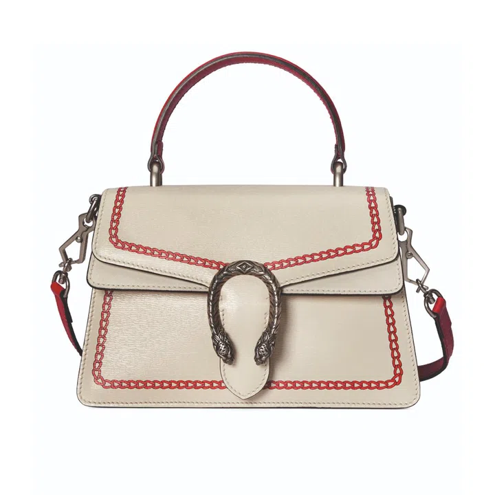This classic Dionysus bag comes in ivory leather this season, with a red chain-trimmed print on the border. The tiger-head palladium hardware is, of course, a constant, but apropos of the Chinese zodiac as well. Flip to the back for the regal interlocking G dragon print, flanked by clouds straight out of a painting.