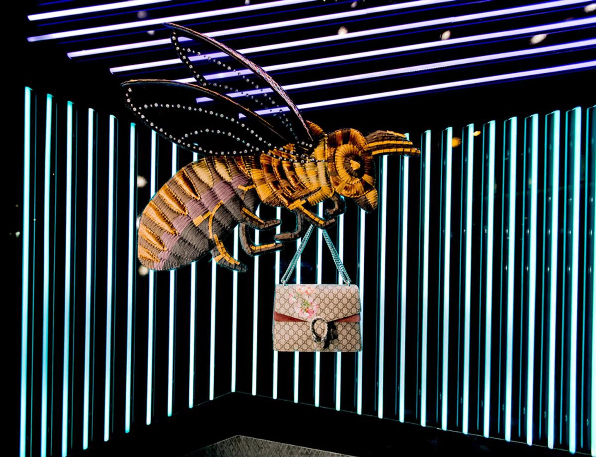 Today, the brand unveils its coolest store window design yet. Turquoise and purple LED lights form a zany backdrop to a giant embroidered swallow or bee (a motif that runs throughout his pieces this season) hovering in mid-air with a Dionysus handbag in its grasp, while a carpet of flowers below it display footwear or jewellery. Other display windows feature a large embroidered snake slithering across the floor where ready-to-wear is shown on rotating rails.