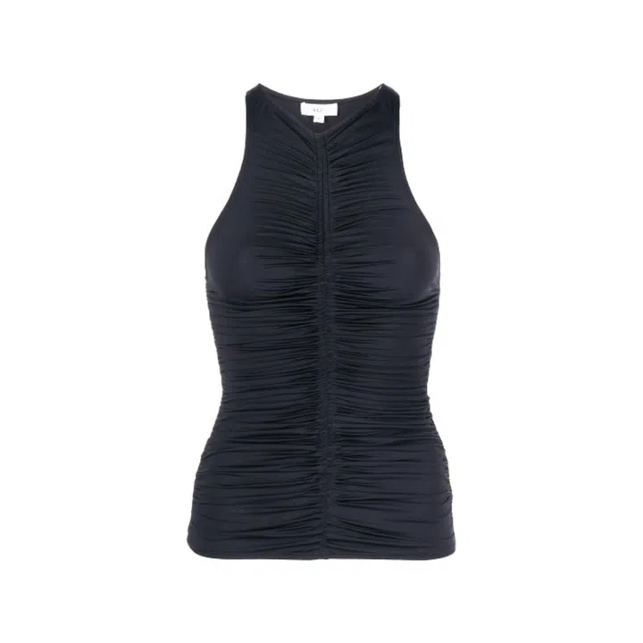 If you prefer something form-fitting and has unique details, try on this black halter top with ruched detailing that’ll look great in any ensemble. Elevate the look by adding a statement necklace.