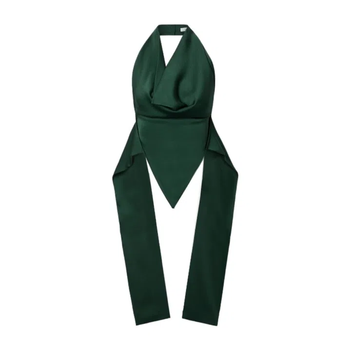 Sustainable fashion label Aaizel‘s iteration of the halterneck top comes in a gorgeous emerald hue. The elegant piece features artful drapes that cascade on the body, a pointed front hem, and a striking open back with skinny ties.