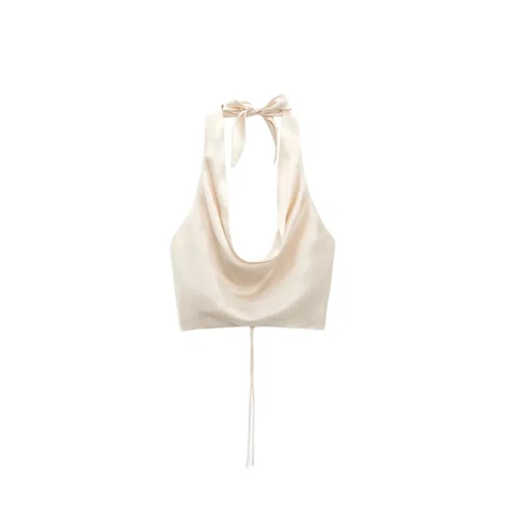 For a glamorous touch on your next social gathering, try on this pearlescent-coloured halterneck top with a flirtatious open back.
