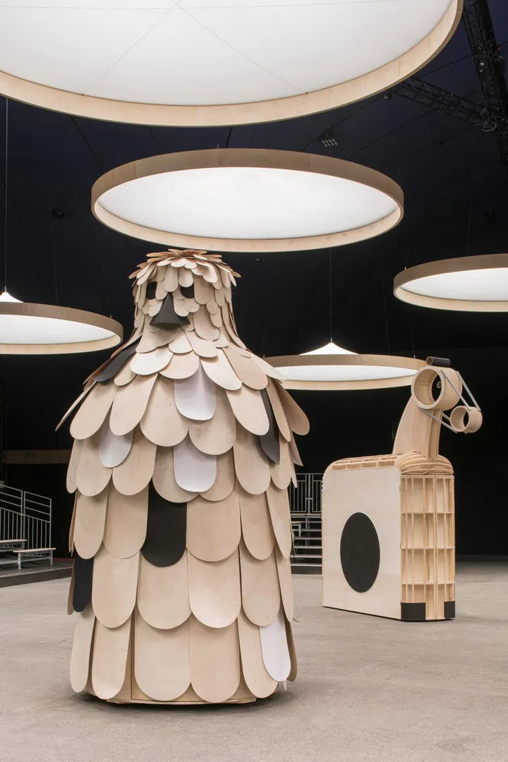 First presented in Paris in January, that show saw Viard roping in her regular collaborator, the French artist Xavier Veilhan, who created 11 bestiary-themed installations of giant creatures made of wood, cardboard and paper in the shape of animals such as an elephant, horse and owl that were rolled onto the show's arena. These large-scale sculptures turned into modern-day Trojan horses when models started walking out of them. As a nod to Veilhan's masterpieces, the presentation in Singapore saw clothes being hung on similar wood and cardboard racks with wheels.