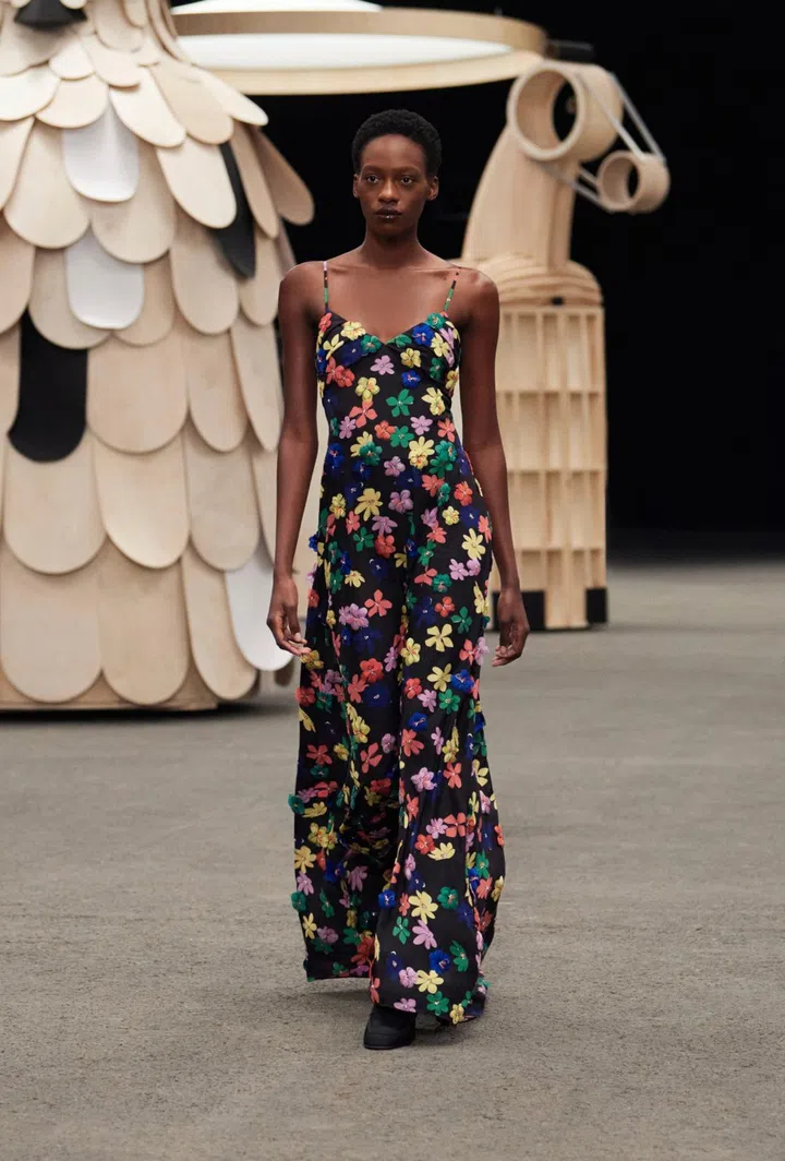 The Cannes Film Festival has kicked off and one outfit that has caught the attention of red carpet watchers is a sleeveless catsuit that American actress/director Brie Larson, who is one of this year's jury members, wore to the photo call on May 16. Irreverent, playful and definitely unpredictable by Cannes' sartorial standards, the look features an all-over red, pink and white hand-painted floral motif that one can easily mistake for tiny sequins. The origin of the look? Chanel Spring/Summer 2023 Haute Couture collection.