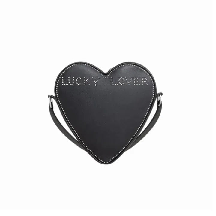 This Celine bag is for those who like a little rock 'n' roll appeal to contrast against the usually cute and romantic heart designs. The edgy style was born from a collaboration with American multidisciplinary designer and video artist Sara Yukiko, who had worked with the brand for its Summer 22 Cosmic Cruiser menswear collection. Yukiko, who is known for giving whimsical and plafyul imagery a dark twist, has added the phrase 'Lucky Lover' in mini metal studs.