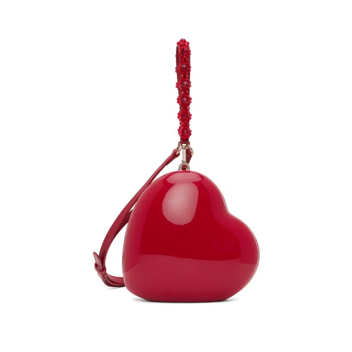 Love the whimsical egg-shaped minaudieres by Simone Rocha? Then you'll get enamoured with this exclusive shoulder bag design the label has created for online retailer Ssense. The hardshell acrylic case in a striking lipstick red has been moulded in the shape of a bubble heart, while the strap is decorated with pretty red crystal beads.