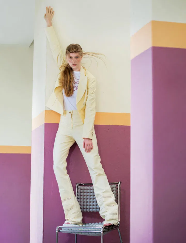 Calfskin coat, linen and cotton jeans, and calfskin sandals.