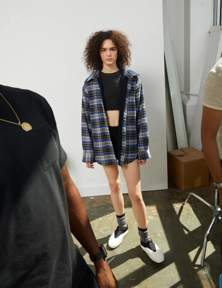 Honing in on inclusive and purposeful fashion, this genderless flannel shirt jacket makes for a great layering option or as an oversized piece to wear on its own.