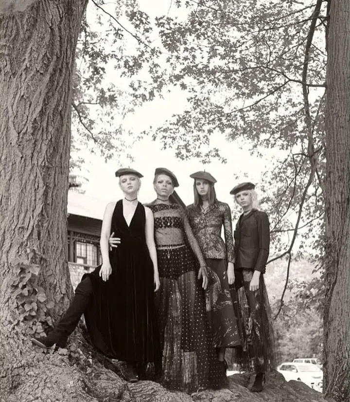 From left: Velvet halter-neck gown and suede boots. Embroidered tulle gown, cotton bandeau, matching briefs, and metal necklaces. Wool jacket, matching skirt, and suede booties. Taffeta jacket, cotton T-shirt, embroidered tulle skirt, and suede booties. On all models: Leather berets, and velvet chokers with metal and resin pearls. All Dior