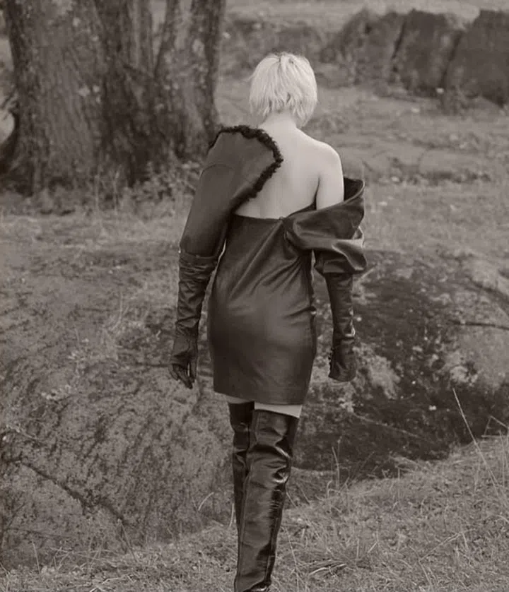 Polyester shirt dress, silk twill pants, and leather boots, Celine.