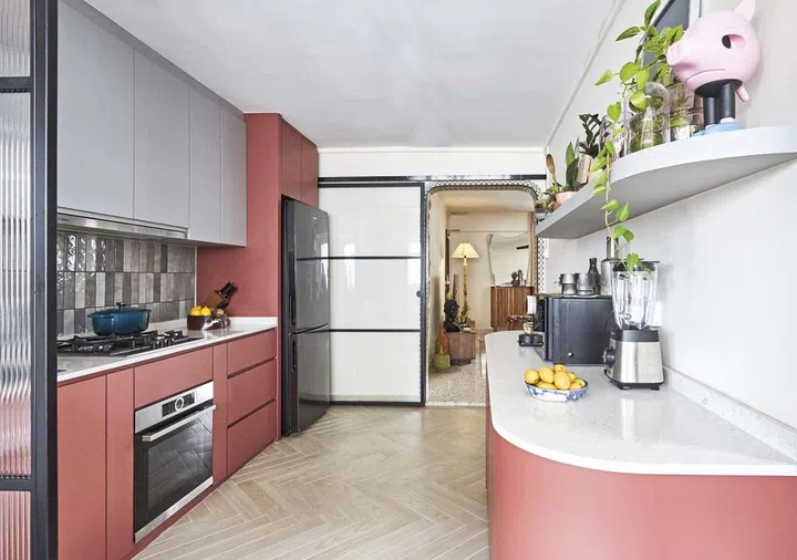 Featuring a beige, grey, and terracotta red colour scheme, the kitchen cabinets are new. “We didn’t try to match everything,” says Hong.