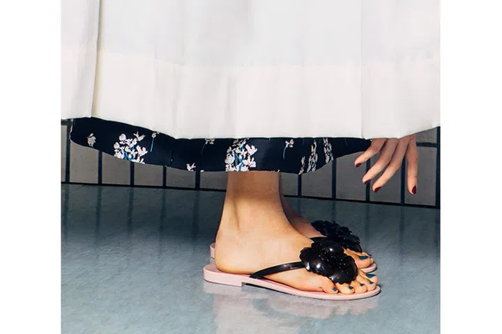 Plastic slippers, $95, Melissa. Erdem x H&M jacquard gown, $349, H&M.