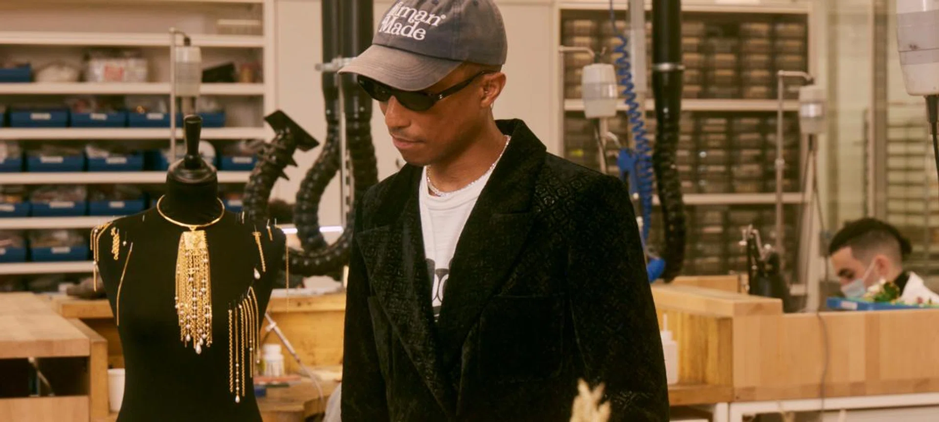 The musician/style icon Pharrell exploring the workroom of the costume jeweller Goossens, which has been working with Chanel since the '50s after Coco Chanel had commissioned its founder to create a piece for her.