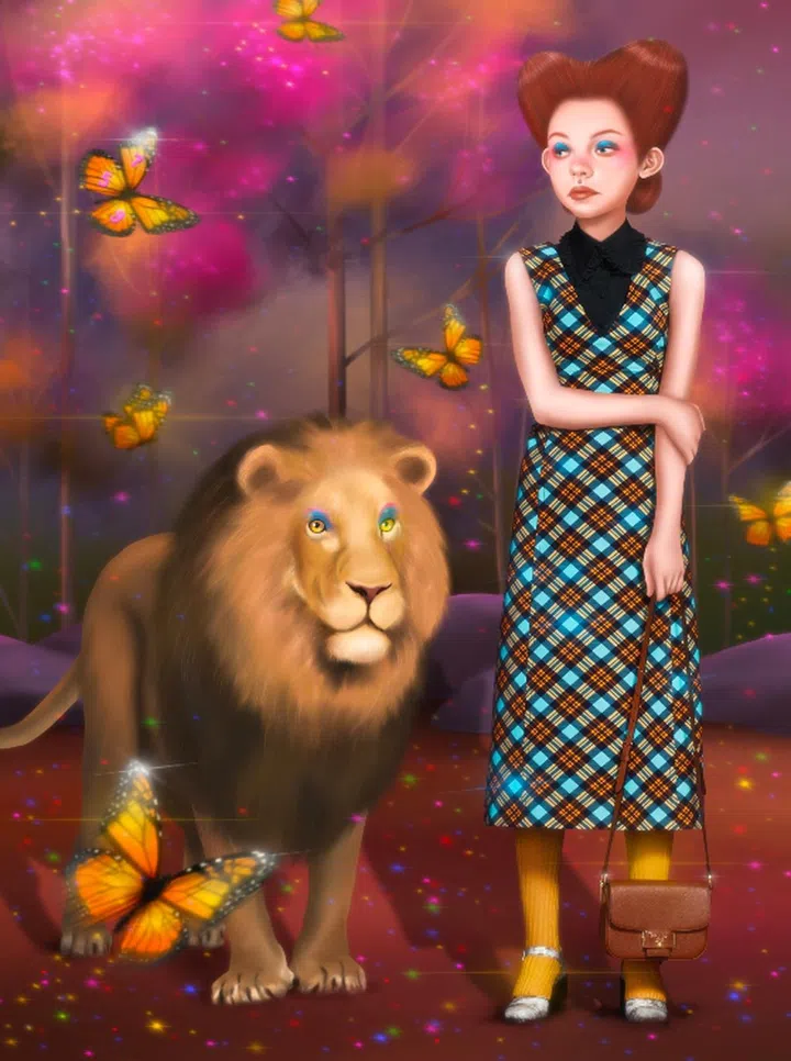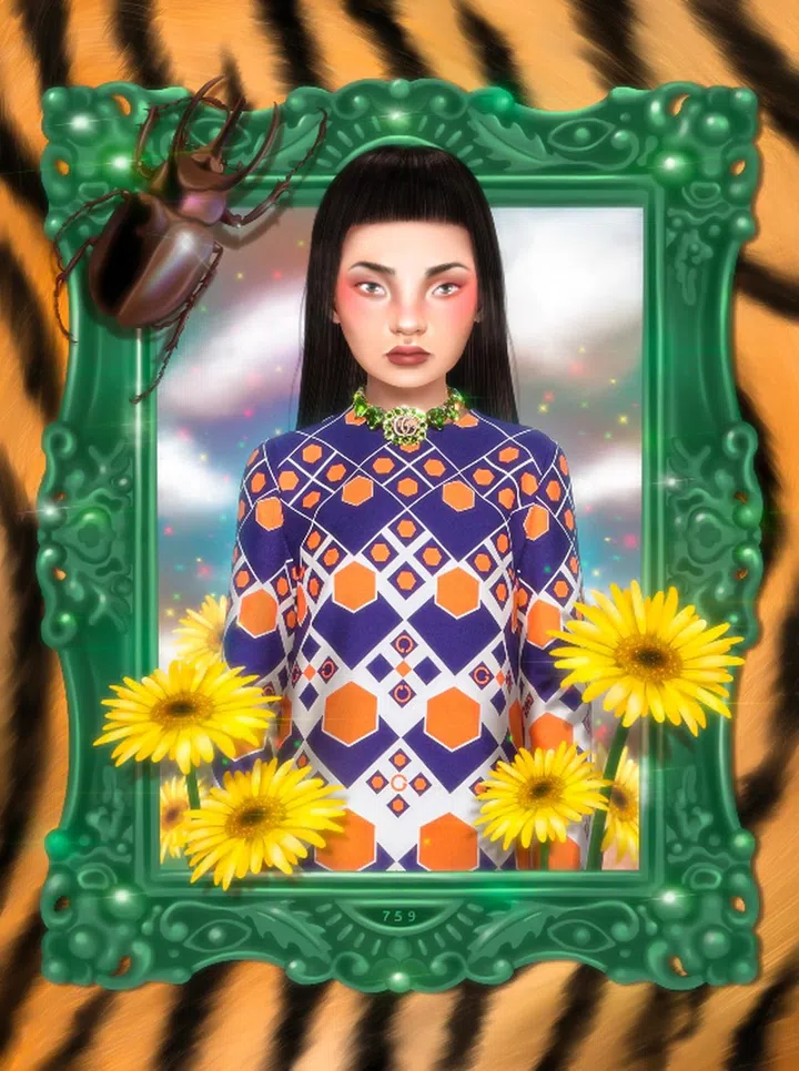 Above: Kim’s images usually feature a figure within a natural environment with a surreal quality. “They’re almost like stills or posters featuring a character from a story,” he says. Here, he turns up the “royal-ness” of this graphic Gucci look by interpreting it into a classic portrait bordered by an equally ornate frame and tiger prints. Wool and silk dress and crystal and gold necklace, Gucci