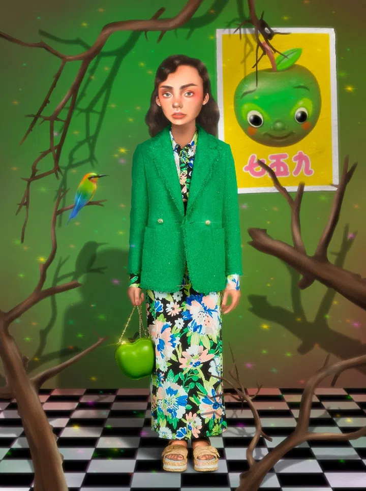 Above: “This outfit is particularly green so I played up on that colour, plus it comes with a cute apple-shaped bag so I wanted to make this image even more cutesy and kitsch.” Tweed blazer, silk shirt dress, Apple leather crossbody bag, and raffia sandals, Kate Spade New York