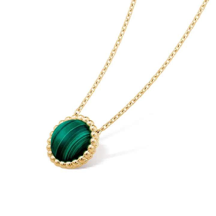 Perlee Couleurs yellow gold pendant necklace with malachite, $2,770, Van Cleef & Arpels