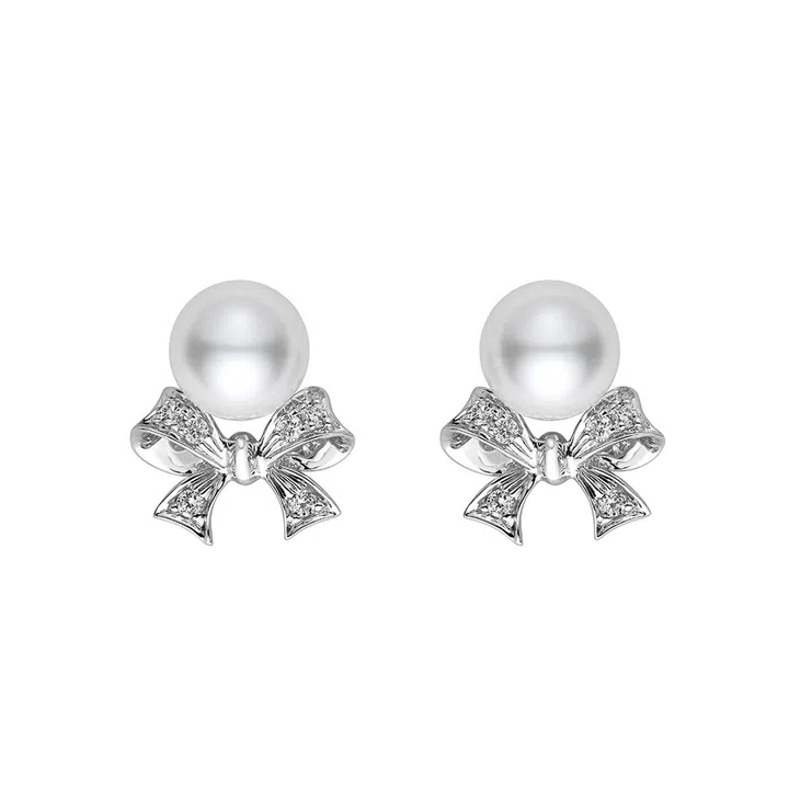 Mikimoto is perhaps the last word in fine, precious cultured pearls. You could go all mademoiselle with strings of them, but I like to imagine starting with little accents. These Akoya pearl-topped earrings are a dainty example, the bow portions set with diamonds.