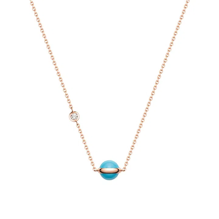 There's something quite magical and talismanic about jewellery, especially heirloom pieces. I love that quality, which I really found in Piaget's Possession necklaces. There's an almost mystical look to them – this one's a turquoise bead wrapped with a gold ring that allows it to move freely, with a diamond subtly set into the chain.