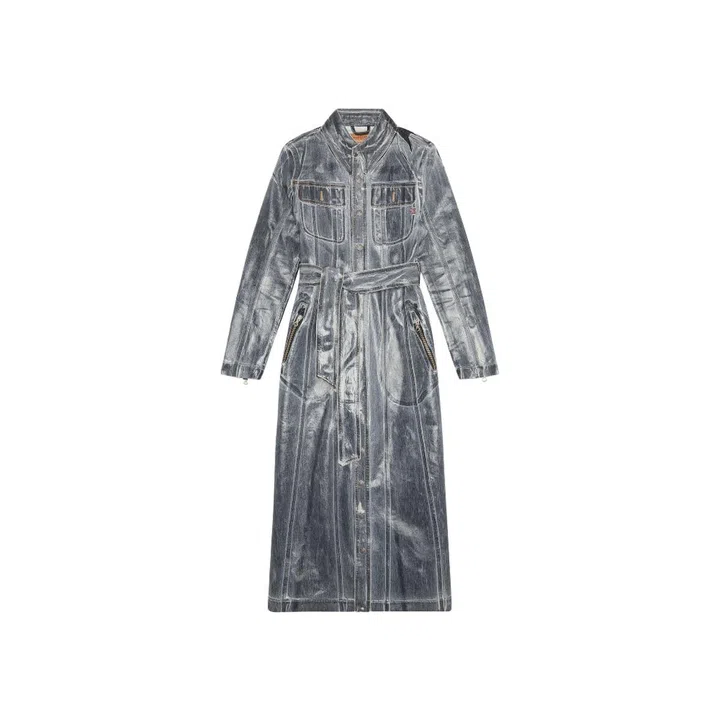 Designed in a trench coat silhouette, this belted shirt dress is characterised by a coating that creates a shiny "film" effect.
